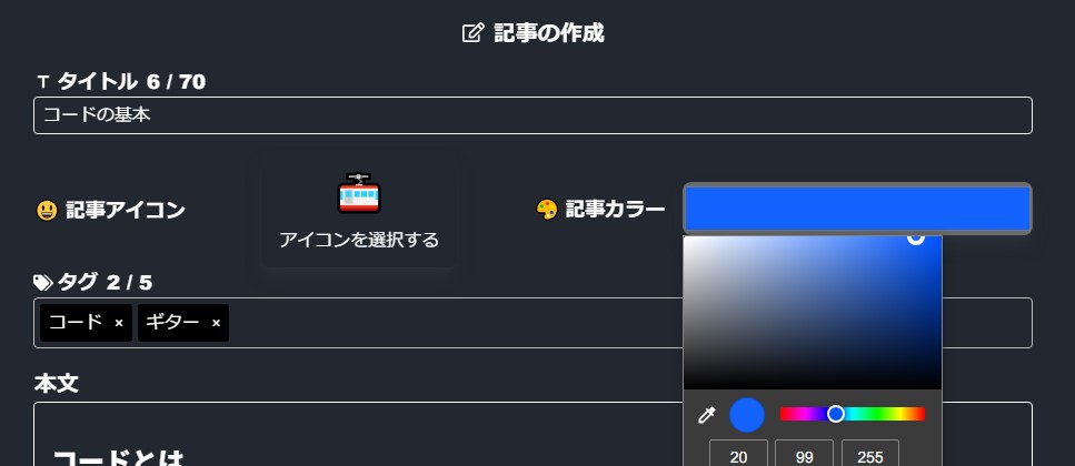 記事の一覧ページやSNSでの表示を賑やかにするために、以下の画像の通り記事ごとにテーマカラーとテーマ絵文字を設定できるようにしました。